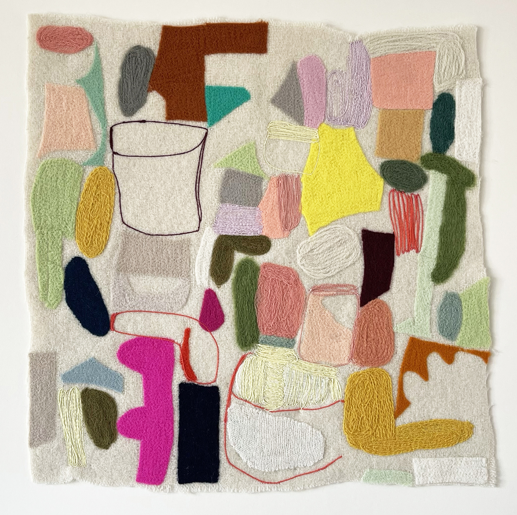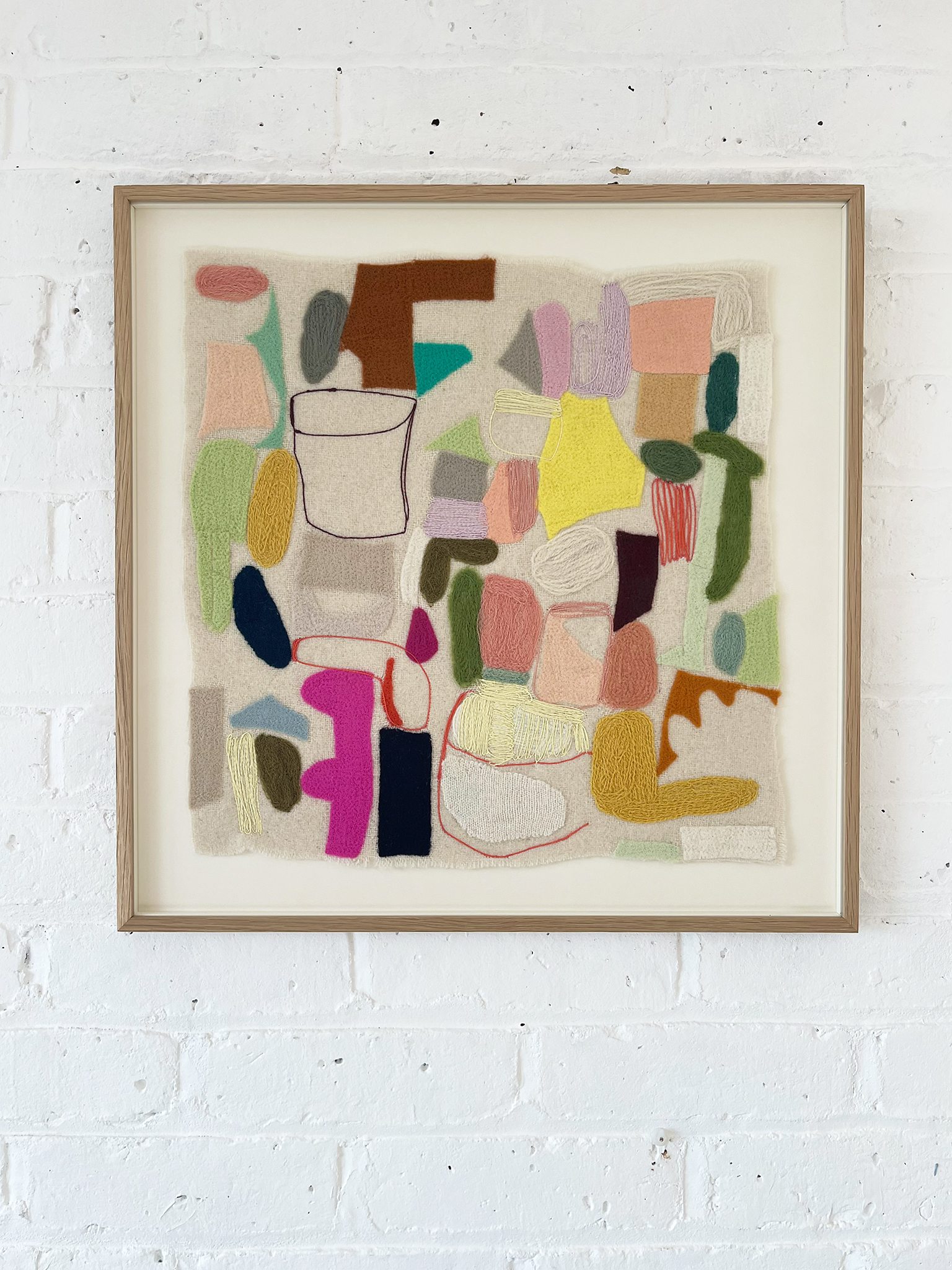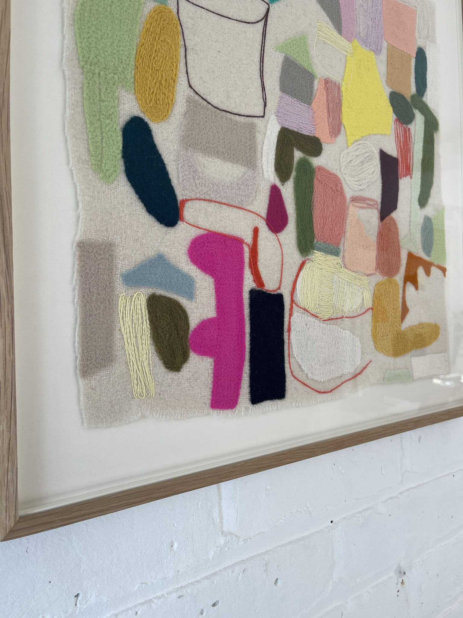 artwork. reclaimed merino wool blanket, needle felt appliqué, and embroidery. Stitch mounted on acid free archival board for framing.artwork + oak frame / rebate