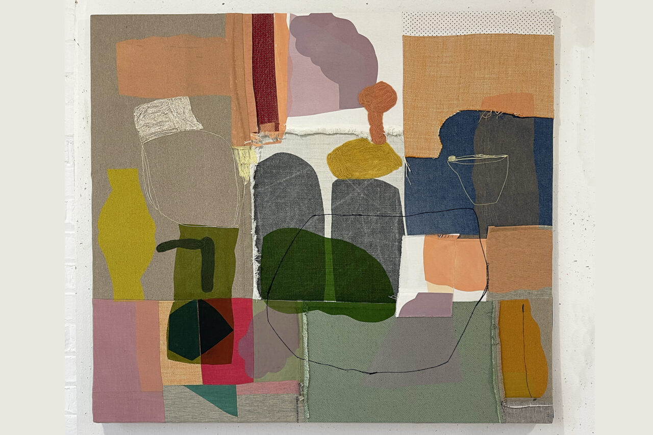 Screen print, appliqué, embroidery. Pieced cotton + linen fabric scraps, wool yarns, water based pigment ink. Stretched
