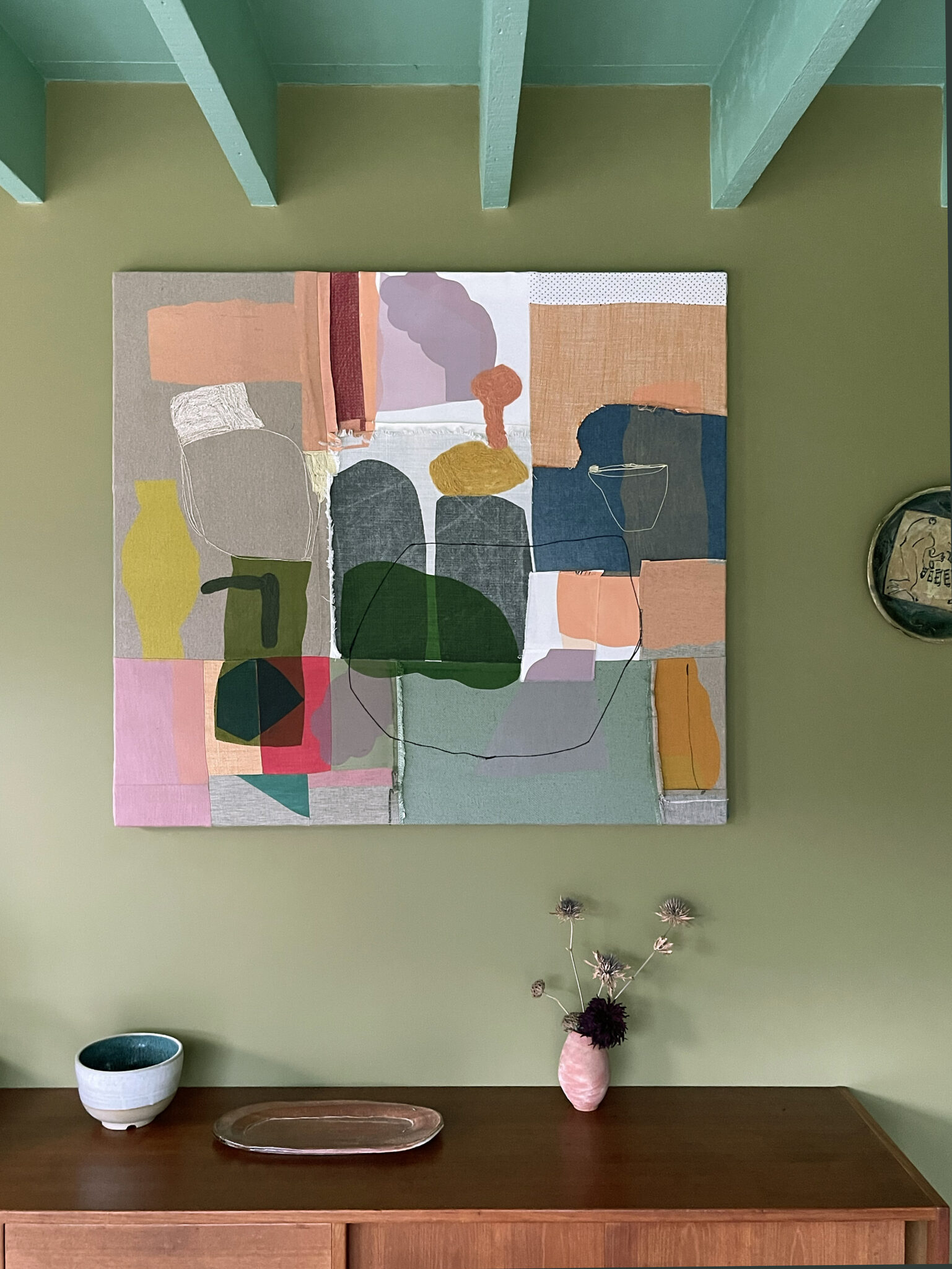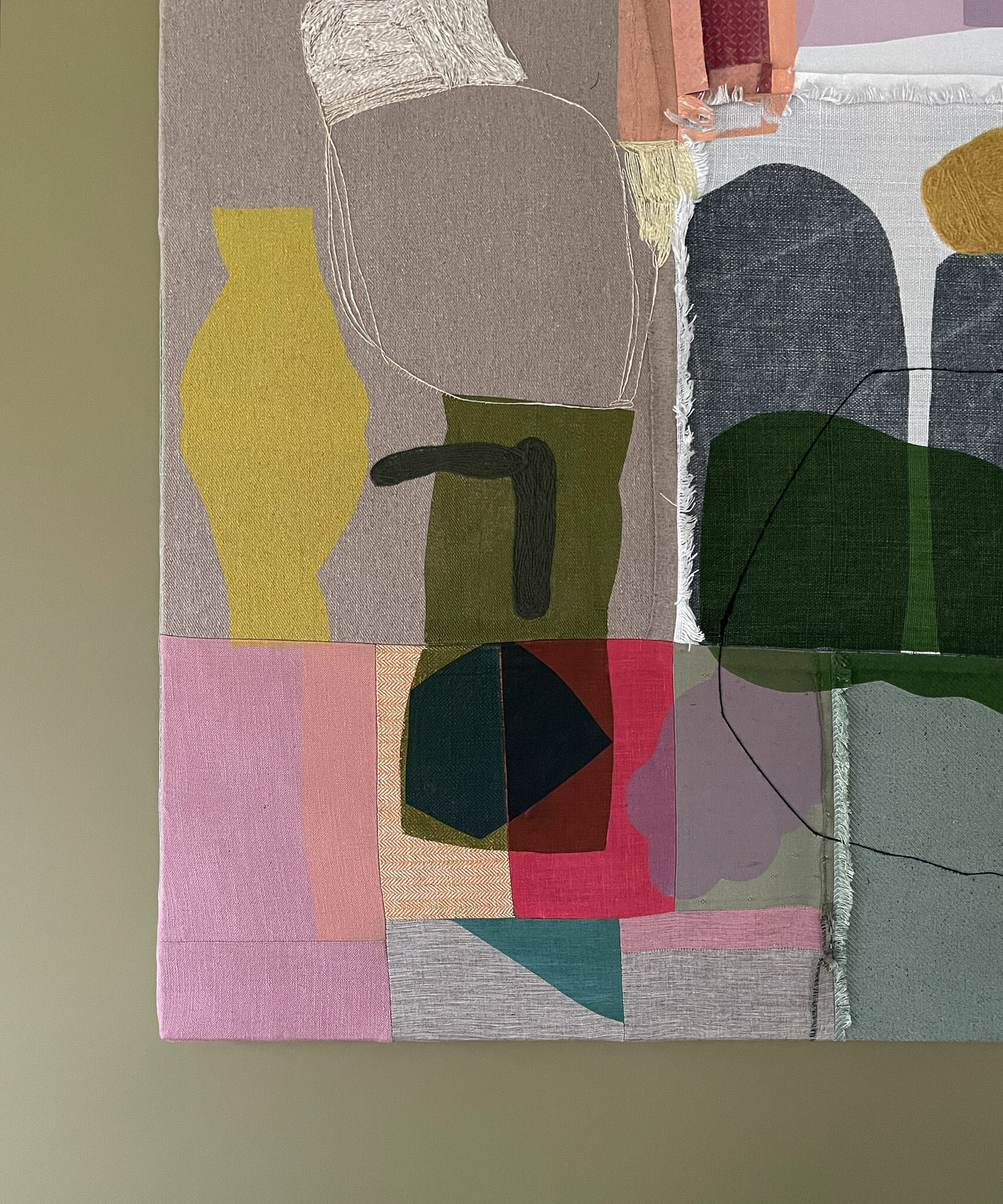 Screen print, appliqué, embroidery. Pieced cotton + linen fabric scraps, wool yarns, water based pigment ink. Stretched