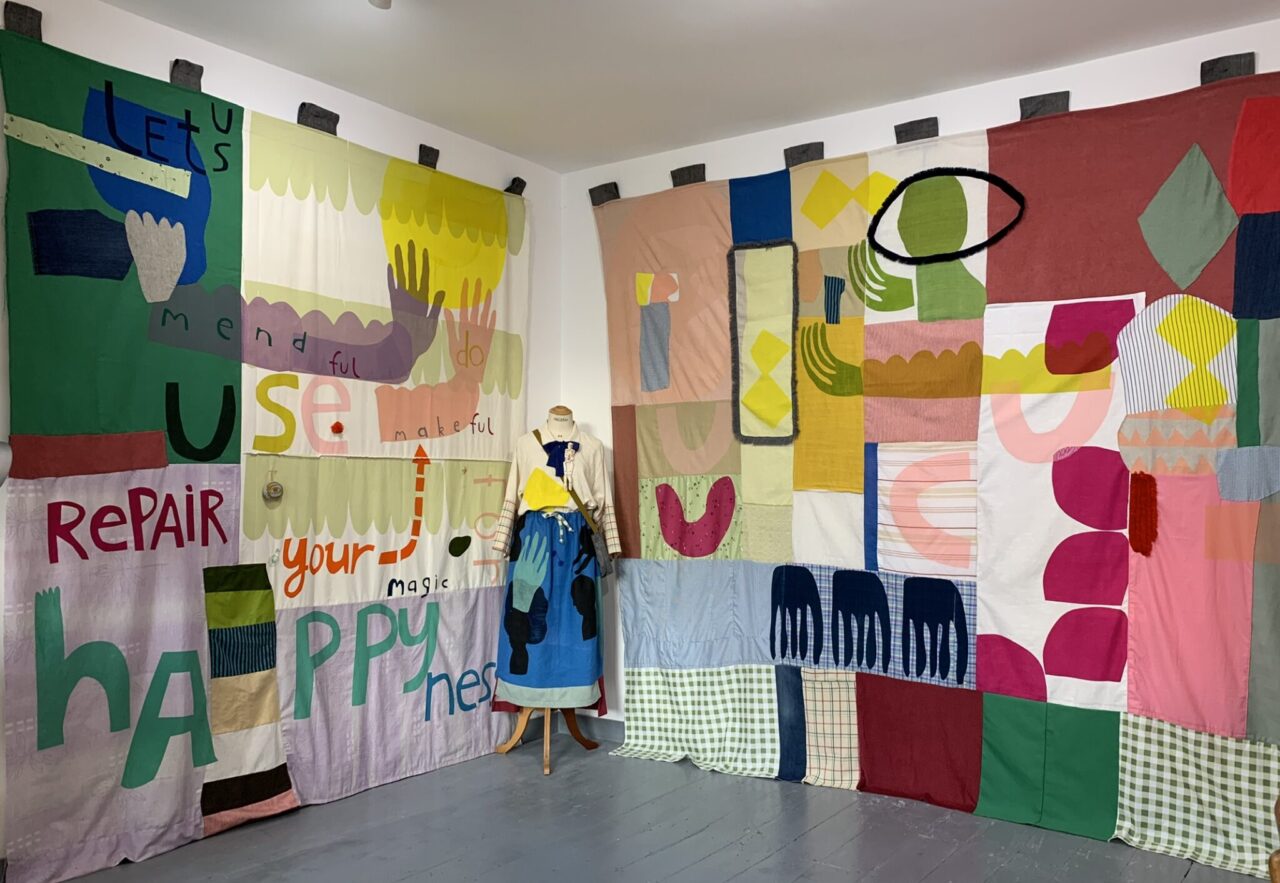 Constructed using screen printing, appliqué, and stitch with reclaimed fabrics, the works emphasised scale, colour, and material presence. The installation focused on the physical and visual impact of hand-worked materials, inviting sustained attention to texture, accumulation, and questions of ‘work’ embedded within cloth.